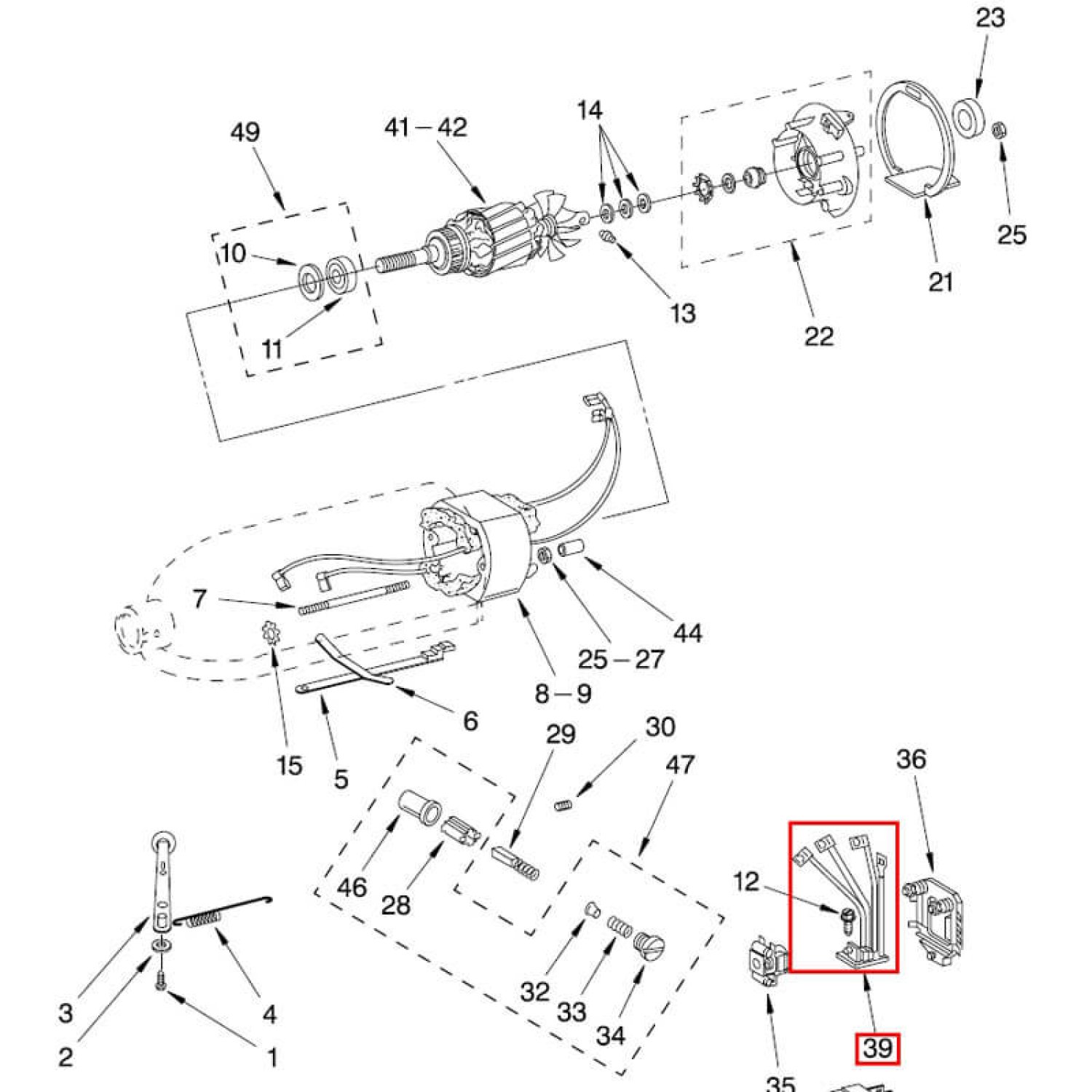 Diese kleine Platine – in der Explosionszeichnung Position Nr. 39 – übernimmt die elektronische Regelung der Motordrehzahl.